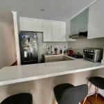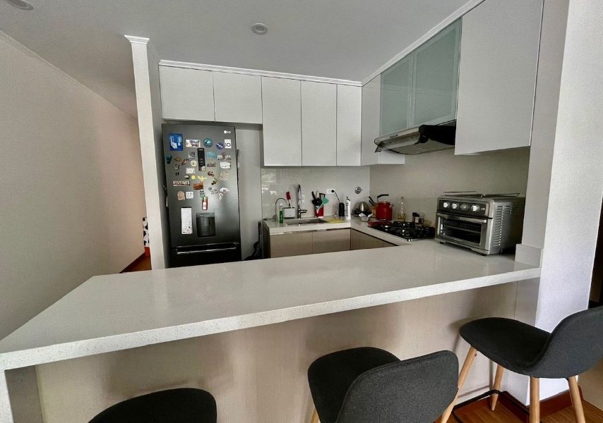 Sala y comedor con mampara a balcón. Cocina abierta con muebles altos y bajos y cuarzo.