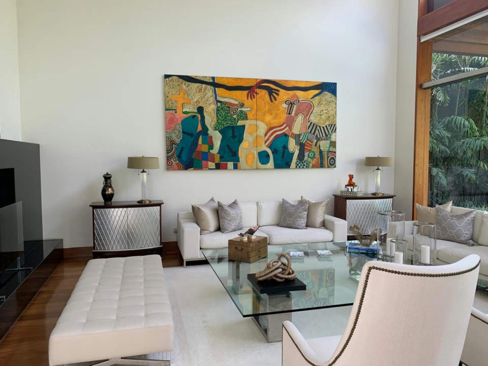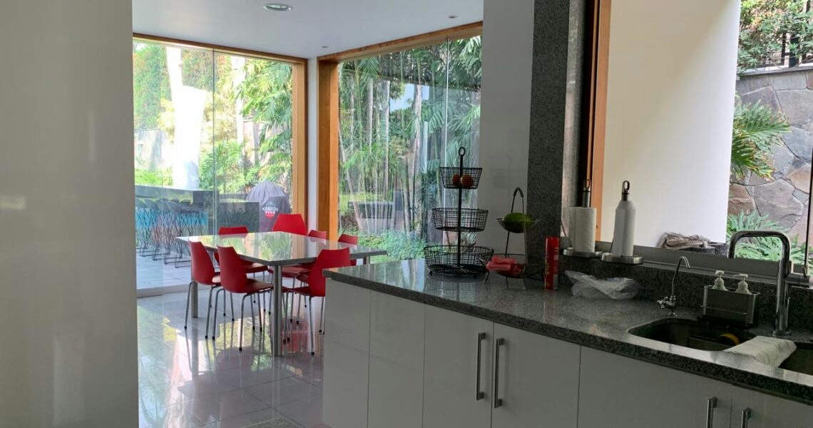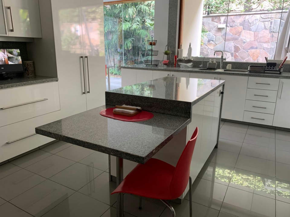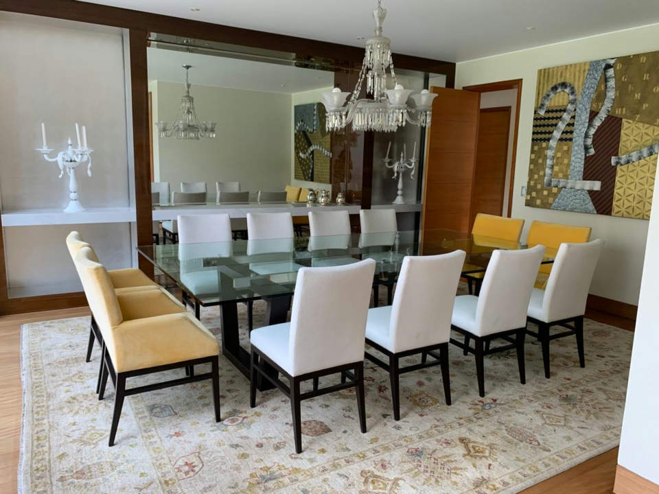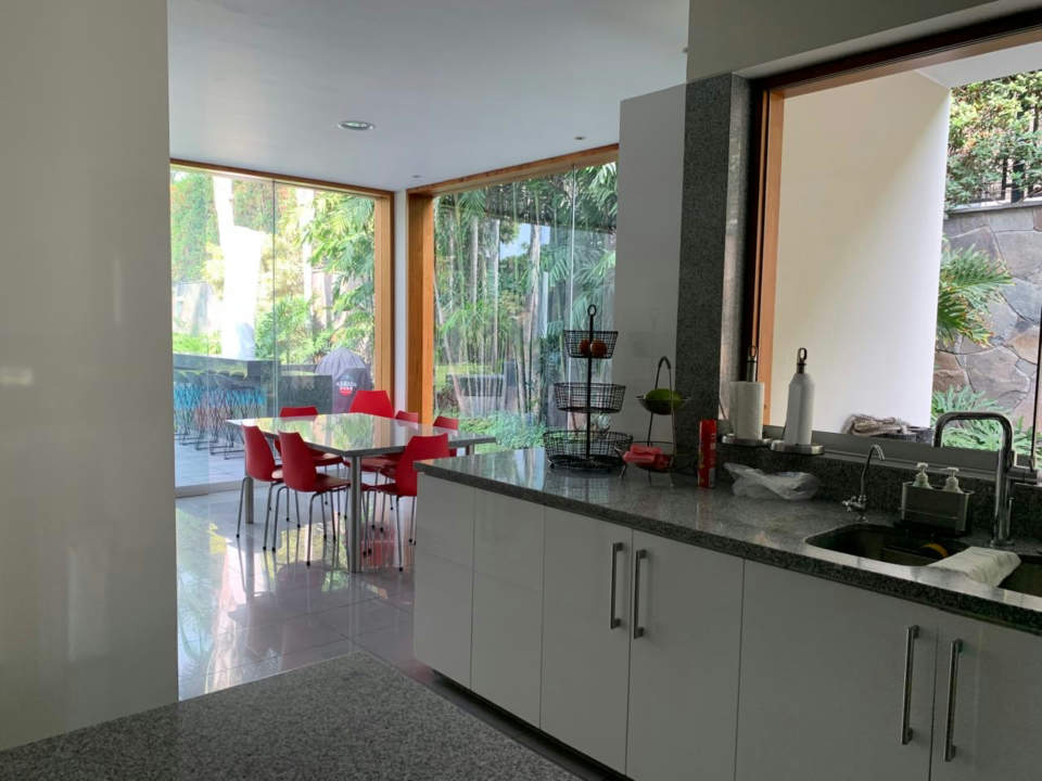 Escritorio, baño de visita, sala con doble altura, bar, comedor, sala de estar, cocina con isla y comedor de diario.