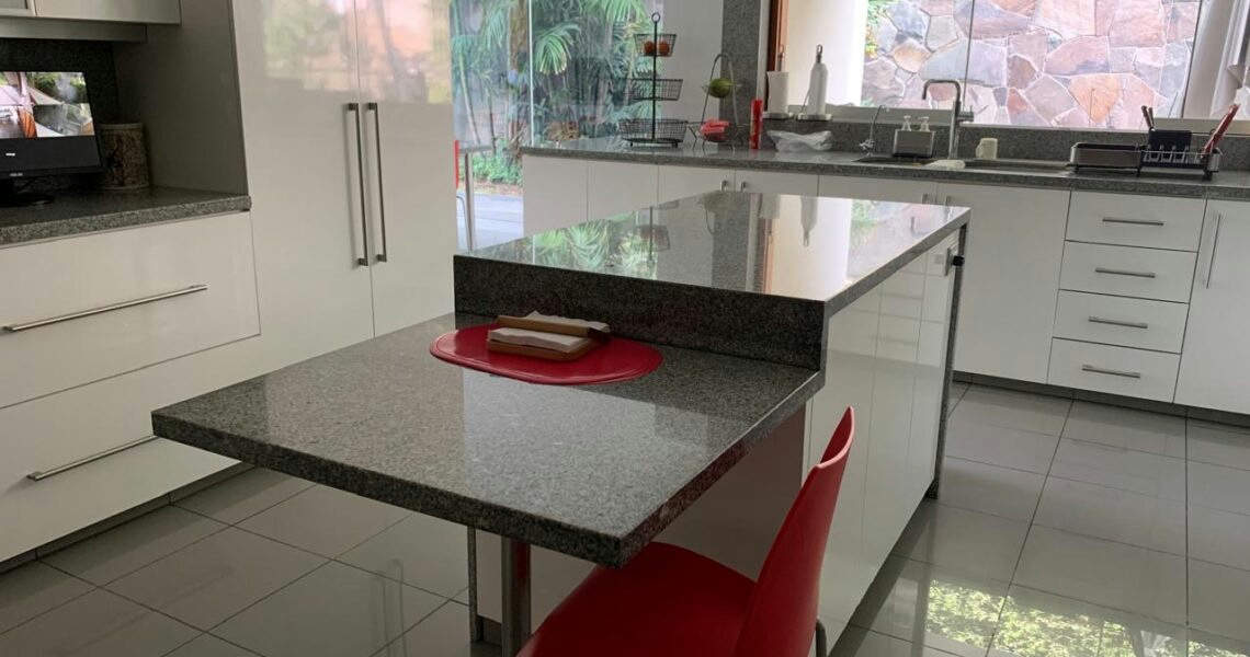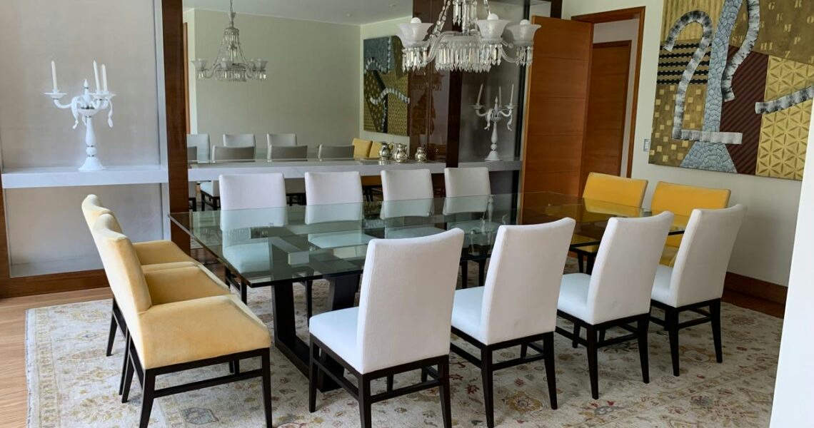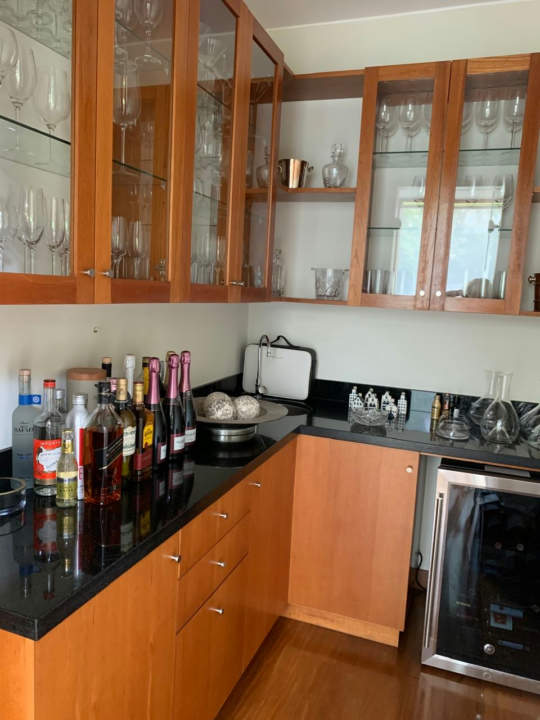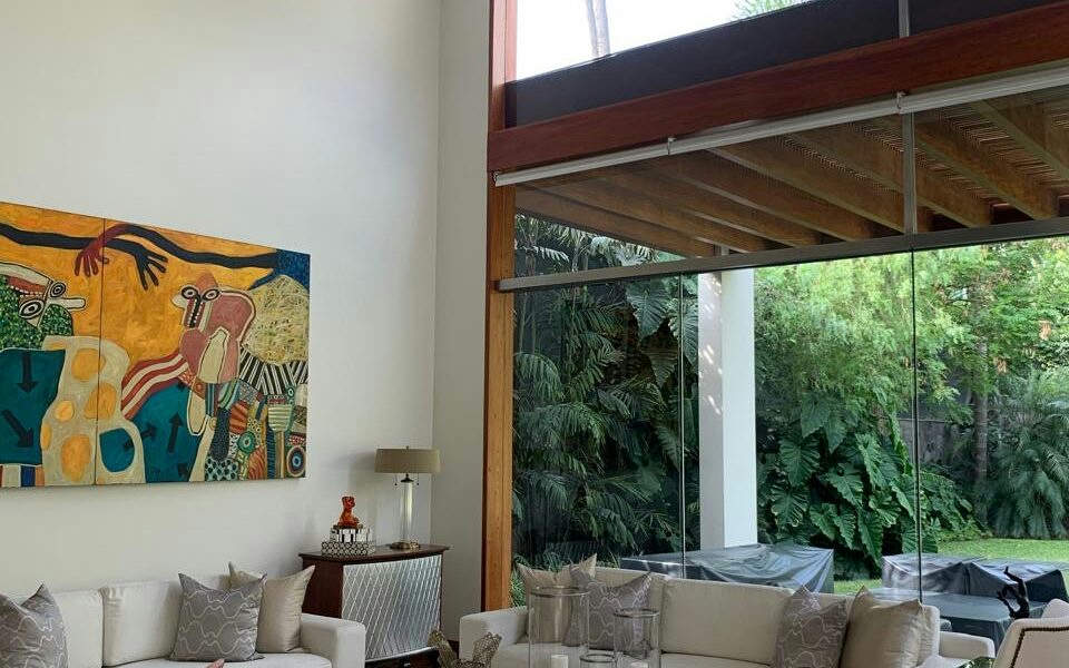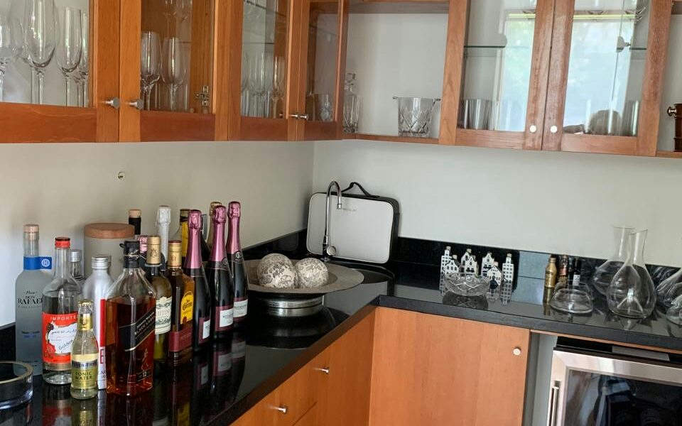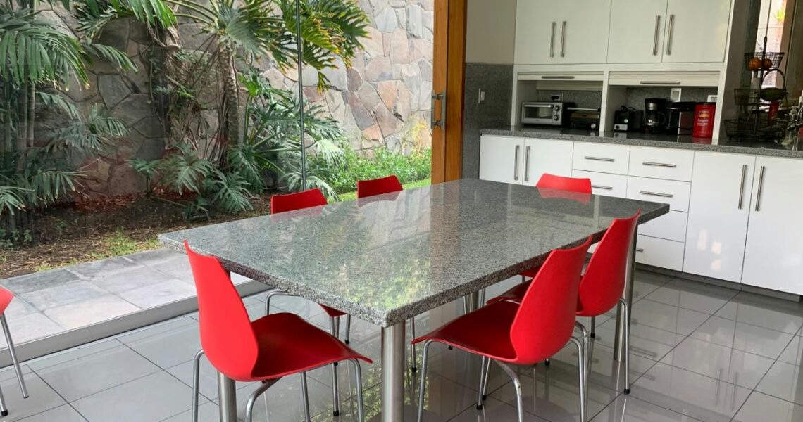Escritorio, baño de visita, sala con doble altura, bar, comedor, sala de estar, cocina con isla y comedor de diario.